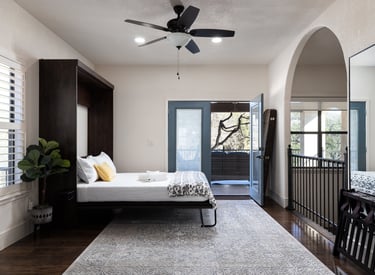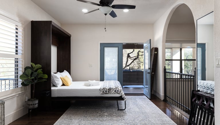 This spacious bedroom is upstairs and leads to a private deck with comfortable furniture. Queen Murphy bed, pull-out sofa, mini bar, Keurig machine, sink, full bath and full size mirror included.
