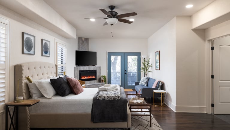 This elegant room leads you to a patio with an outdoor table and chairs. It offers a queen bed, pull-out sofa, and roll-away cot. An electric fireplace, TV, full-size mirror, and full bath are also included.