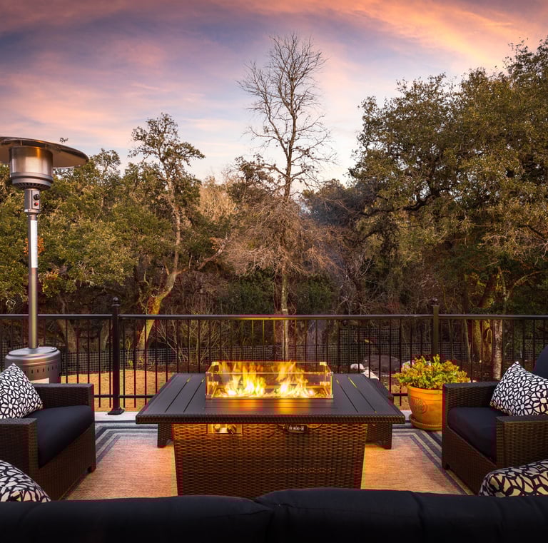 Massive patio with fire table, heaters, fans, propane grill, and large additional space to host a cocktail hour.